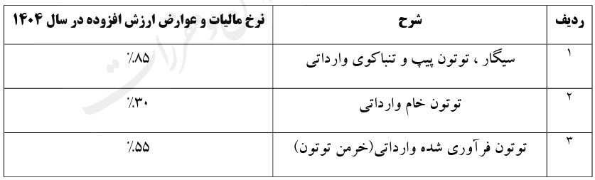 پیرو بخشنامه های شماره ۱۴۰۲/۱۸۹۰۸۷۴ مورخ ۱۴۰۲/۱۲/۲۸ و ۱۴۰۳/۱۵۲۹۲۲۵ مورخ ۱۴۰۳/۱۰/۱۹، ضمن ارسال تصویر نامه شماره ۲۰۰/۲۵۷۲۷ /ص مورخ ۱۴۰۳/۱۲/۲۱ سازمان امور مالیاتی کشور، بدینوسیله نرخ مالیات و عوارض مالیات بر ارزش افزوده مصوب سال ۱۴۰۰ جهت انواع سیگار و محصولات دخانی وارداتی در سال ۱۴۰۴ به شرح جدول ذیل اعلام می گردد .
