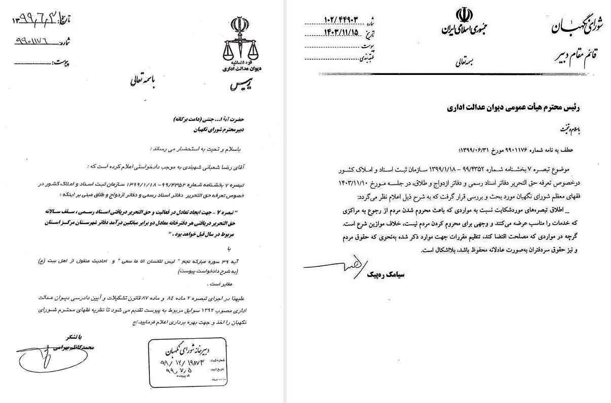 در پی شکایت یک سردفتر اسناد رسمی از تبصره ۷ بخشنامه سازمان ثبت درخصوص تعرفه حقالتحریر دفاتر اسناد رسمی و ازدواج و طلاق در دیوان عدالت اداری و استعلام از شورای نگهبان، فقهای این شورا چنین اعلام نظر کردند: